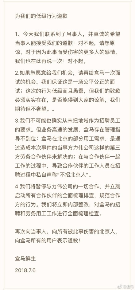 36氪讯,盒马鲜生称,今天联系到了当事人,并真诚地希望当事人能够接受道歉。“如果您愿意给我们机会,请再给盒马一次面试的机会。我们保证这是一场公正的面试;这次的行为低级而愚蠢,将暂停和力伟公司的一切合作,并立刻启动所有合作伙伴的全面排查,规范合作方行为。”