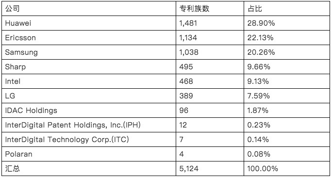 截止2018年6月14日,根据ETSI上声明数据统计,由华为、爱立信、三星、夏普、因特尔等10家企业声明5G标准专利达5401族;在5G新空口领域,累计声明标准专利总数高达5124族;在5G新核心网领域,累计声明标准专利总数为277族。其中,我国的华为公司声明的5G标准专利共1695族,在5G新空口领域1481族,在5G新核心网领域214族。