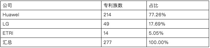 在5G新核心网领域(见表2),目前仅有华为、LG、ETRI三家企业声明持有相关标准专利,总数为277族。其中,华为以214族(占比77.26%)声明专利排名榜首,LG以49族(占比17.69%)声明专利排名第二,ETRI以14族(占比5.05%)声明专利排名第三。