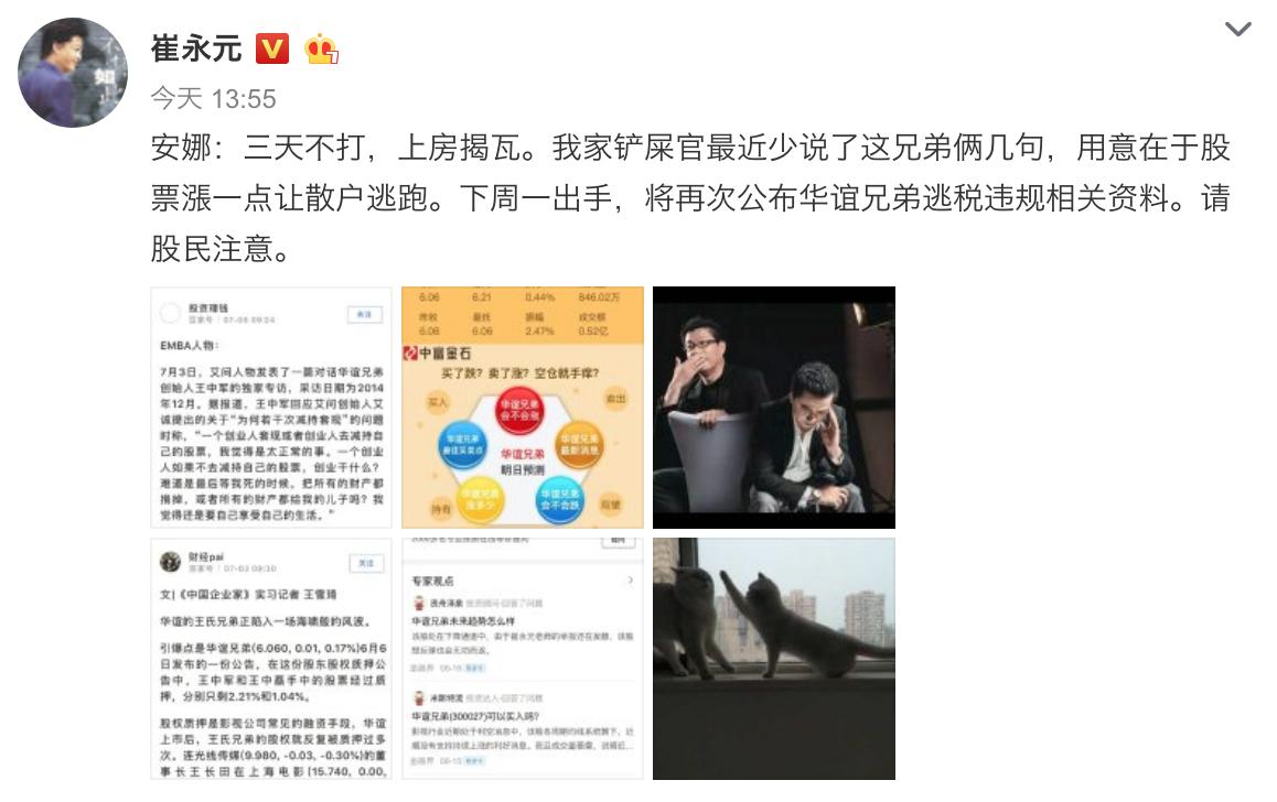 崔永元:下周一将再次公布华谊兄弟逃税违规相关资料,请股民注意