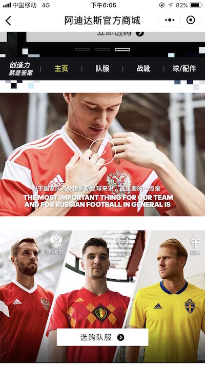 在阿迪达斯中国官方商城,目前留在赛场上的俄罗斯、比利时、瑞典球迷版比赛服依然以599元的原价出售,并且取代了德国、阿根廷、西班牙,占据了页面最显著的位置。东道主俄罗斯,更是代替德国“C位出道”。