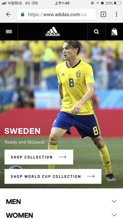 北欧球队甚至都没怎么出现在阿迪达斯的世界杯海报宣传中,在线下门店中也缺乏存在感。但随着瑞典走得更远,瑞典队队员埃克达尔的图片一度出现在了阿迪达斯美国官网的首页。