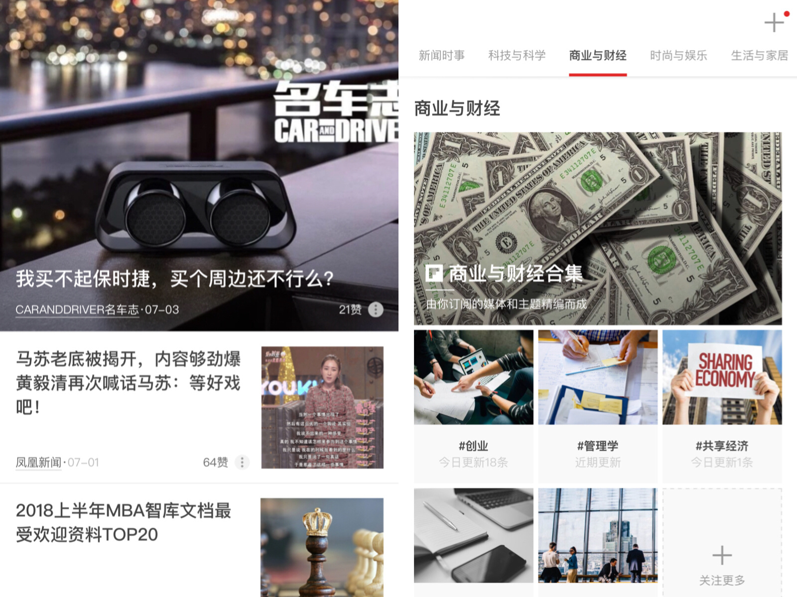 其产品设计风格类似杂志,内容产品呈现上,每屏只有3-4条内容,减少信息密集度、突出图片呈现,让阅读更聚焦,滑动翻页的设计也和杂志的阅读感类似。阅读体验和其他新闻客户端满屏文字的信息流形成鲜明对比。