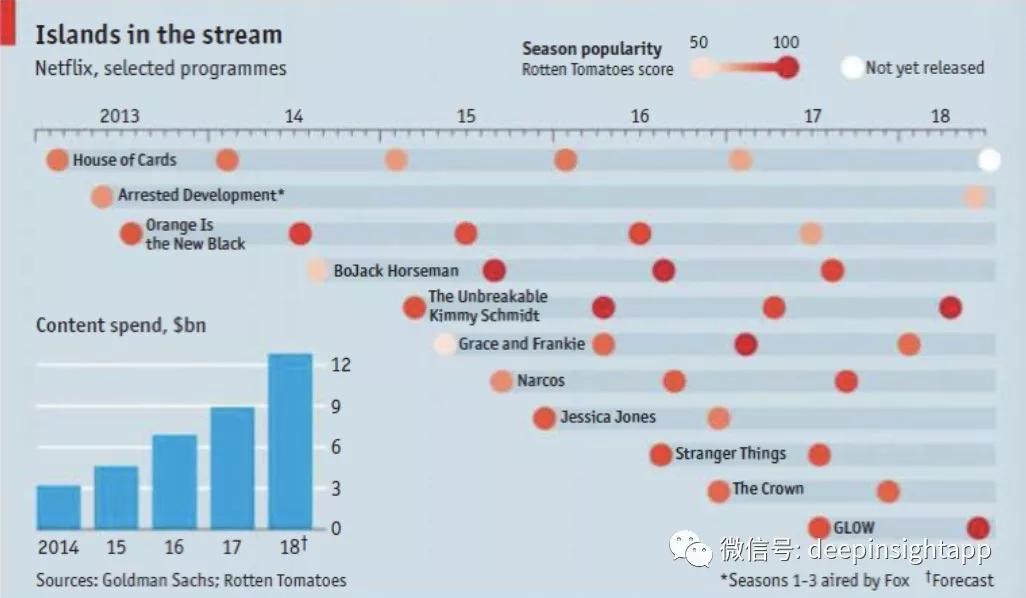 关于Netflix的内容投入,许多人最早都是通过“纸牌屋”知道的。在当时还是一部电影一个亿美元就是大投入的年代,Netflix居然在一部电视剧上投入1亿美元的制作费,找到Kevin Spacey这样的得过奥斯卡最佳男主角的演员,以及好莱坞最好的导演之一David Fincher。在过去,电视剧都是小投入,一个典型的成长路径都是从电视演员转型成电影演员。包括Will Smith,George Clooney等都是如此。今天,Netflix颠覆了这个传统的路径。