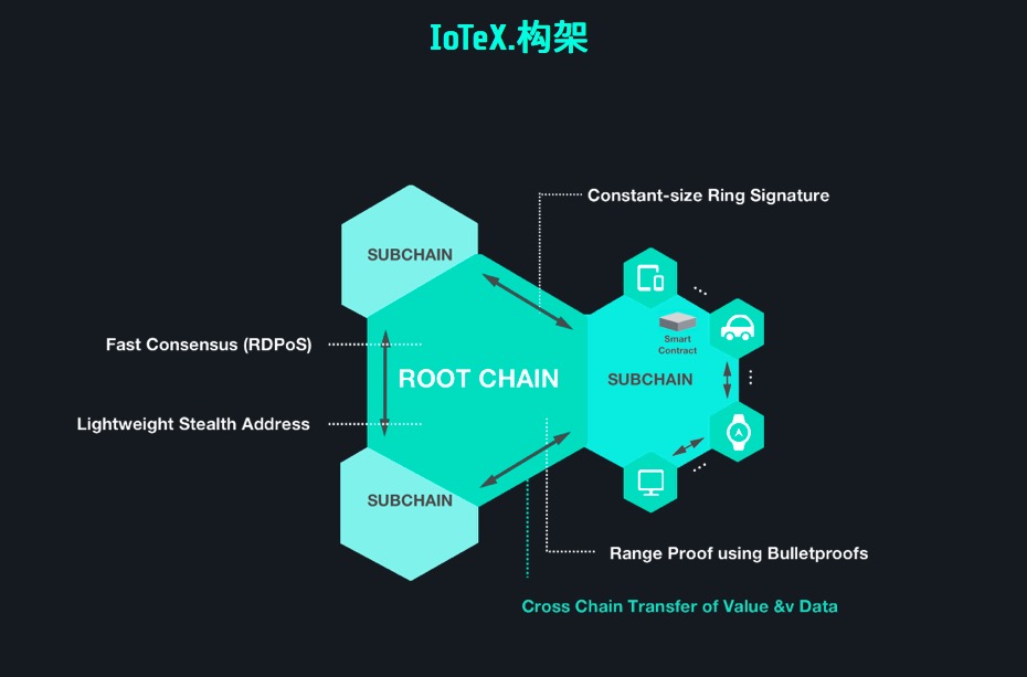 IoTeX 想打造一条跟物联网联系紧密的公链,并满足物联网世界的三个需求:物联网设备的大量交互需求,保护数据隐私安全和异构性(可以简单想象成,不断有新的设备加入到原有的物联网网络中,旧设备和新设备间不断交互,使得网络环境变得复杂。)。在 IoTeX 公链的设计上,其使用的是主链+子链的构造机制。