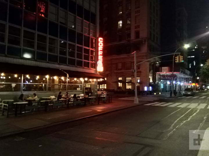 即使是廉价手机,摄像头也很不错了,但是在低光环境下,表现就差了很多。第一次对比时,我们在联合广场的一家餐厅外拍摄,此时,Moto G6的大光圈优势体现出来了。它拍出的照片比诺基亚6.1更清晰,更明亮,你可以看到更多细节,比如附近大楼的窗户细节。在诺基亚6.1拍出的照片中,霓虹灯广告牌更讨人喜欢,至于照片的其它部分,那就很糟糕了。