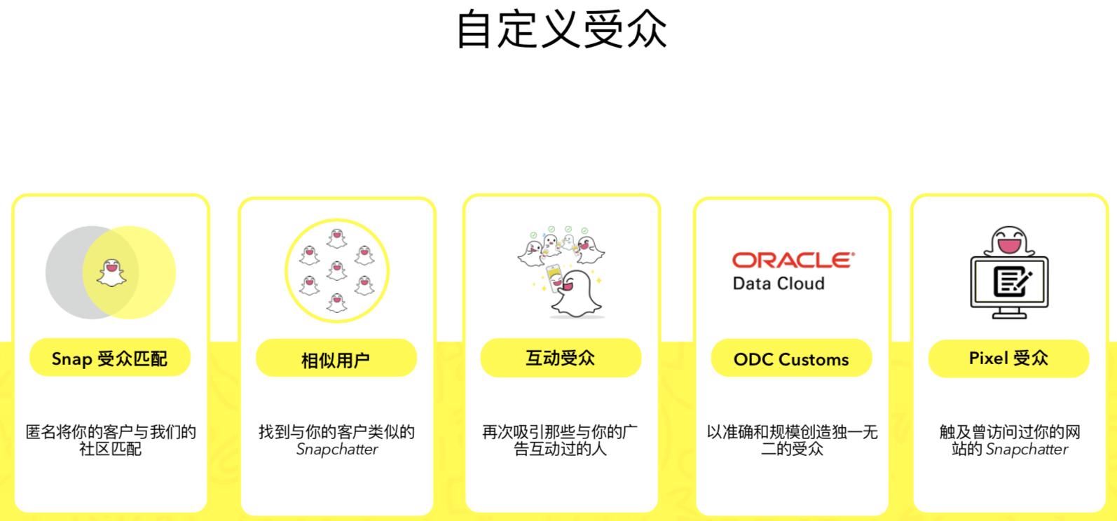 值得一提的,Snapchat允许广告主通过多种不同方式,自定义广告的投放用户。广告主投放的广告既可以和Snapchat社区用户相匹配,包括设置“Snap受众匹配”“相似用户”和“互动受众”,又可以得到第三方数据的支持,和PlaceIQ、Oracle Data Cloud展开合作,获得用户在其它平台的信息,再来投放。