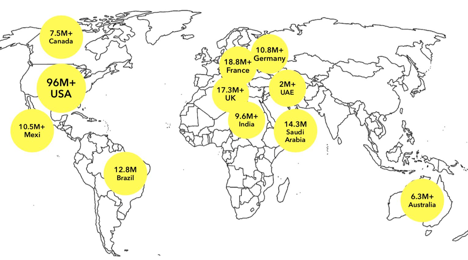 首先,数量庞大、遍布全球。Snapchat在全球范围内拥有1.9亿用户,这些用户主要分布在美洲、欧洲和中东。其中美国用户最多,达到9600万。