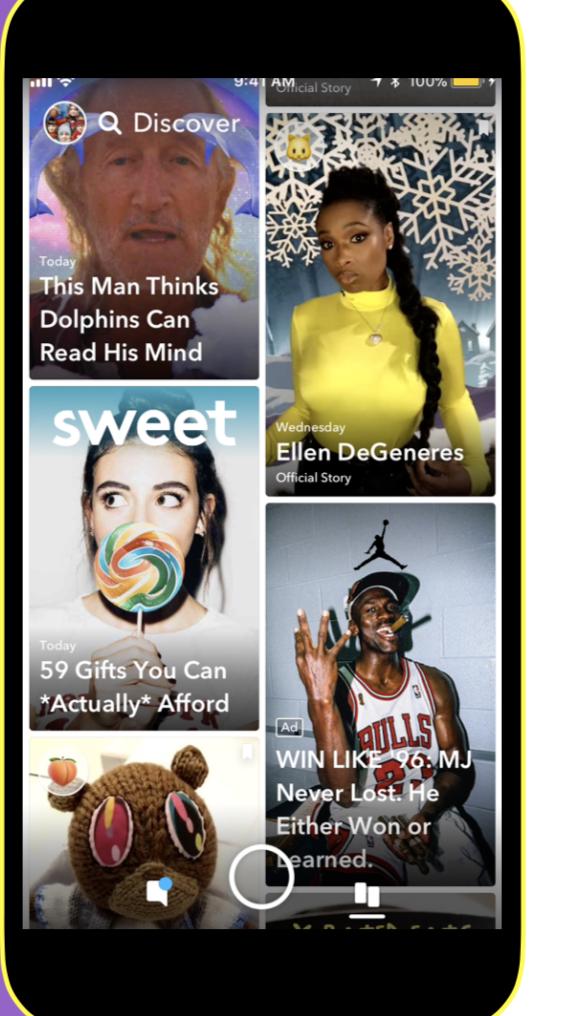Discover是Snapchat的一个频道,为用户提供新闻和娱乐内容。广告主可以通过Discover订阅源中的Story Ads展示专属于自己的广告内容,讲述品牌故事。用户点击Story Ads板块后,会进入到3到20个snap构成的浸入式故事中,广告主可以讲述更长和更丰富的广告内容,从而提升品牌知名度和影响力等。