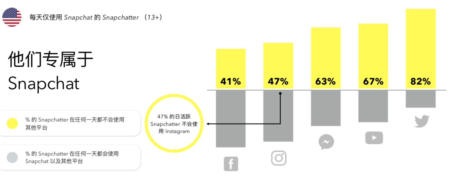 然后,用户具有一定的排他性。Snapchat用户和其它平台并不重合。以美国和中东用户为例,47%和52%的日活跃用户不会使用Instagram,41%和81%用户不会使用Facebook。因而广告主在Snapchat上投放广告,能够触达更多的年轻用户。