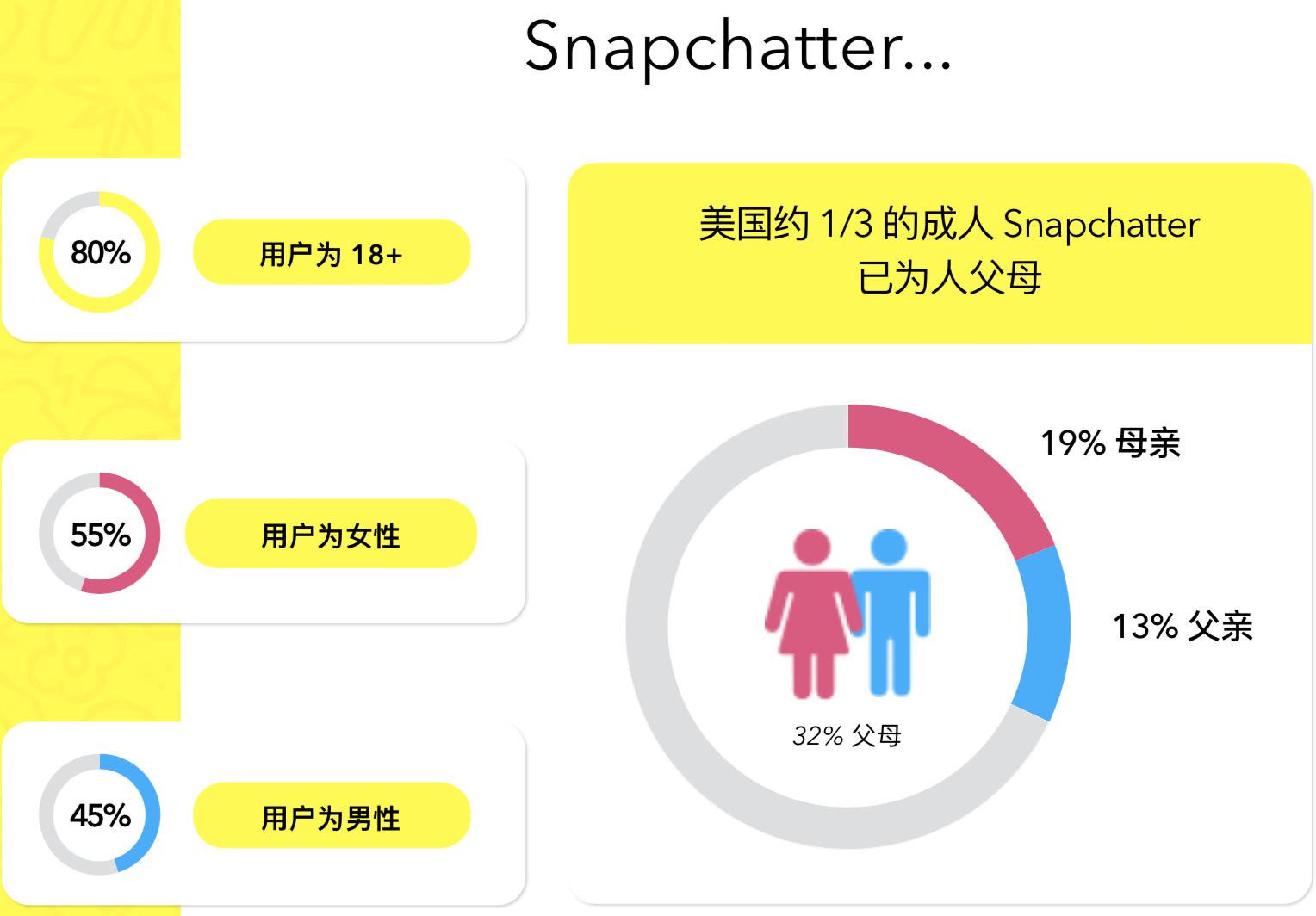 其次,用户年轻,女性为主。越来越多的年轻用户开始使用Snapchat,他们喜欢和朋友及其家人互动。仅在美国,35岁以下用户占到了总用户的83%,其中18岁到24岁的用户占到了36%。值得注意的,Snapchat的美国用户,以女性为主,占比达到了55%;美国约三分之一的成人Snapcha用户已经为人父母。