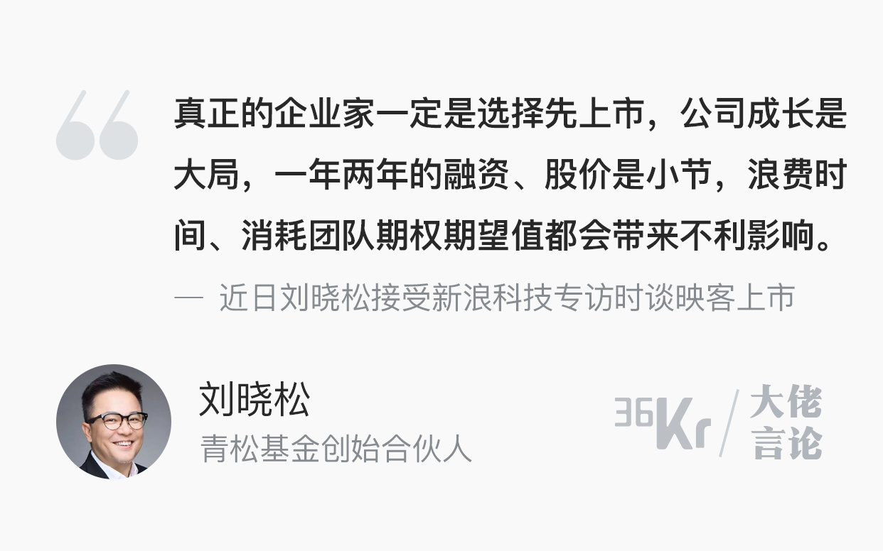 他表示,选择在资本市场相对较差的时间点上市,这并非是外界认为的“不明智之举”,临近上市了一定要上,“真正的企业家一定是选择先上市,公司成长是大局,一年两年的融资、股价都是小节,浪费时间、消耗团队期权期望值都会带来不利影响。”(详情阅读)