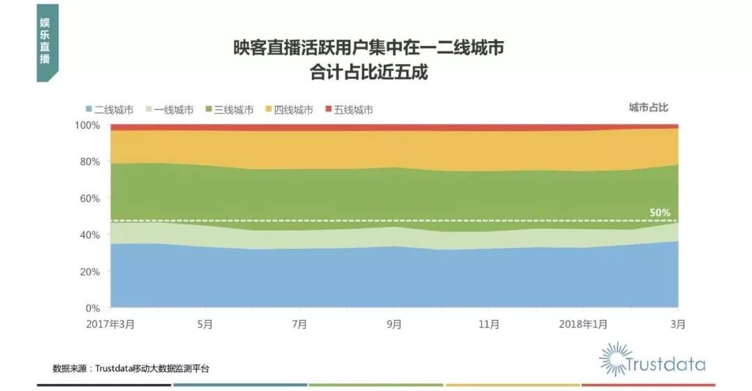 2017年,映客平台57.4%的用户来自一二线城市,为行业第一;Trustdata《2018年Q1中国移动互联发展分析报告》显示,映客直播活跃用户集中在一二线城市合计占比近五成。