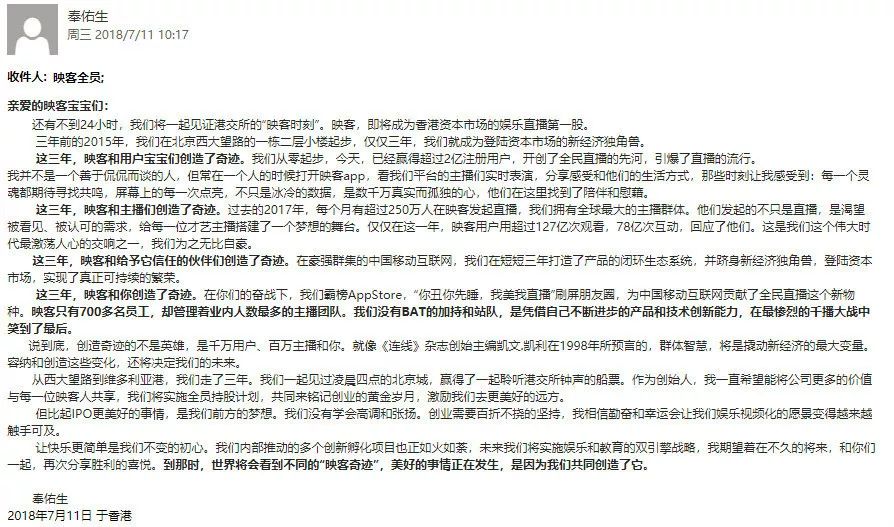 昨日上午,奉佑生发表了一篇内部信。称映客即将成为香港资本市场的娱乐直播第一股。而过去的2017年,每个月有超过250万人在映客发起直播,全年映客用户完成了超过127亿次观看,78亿次互动。