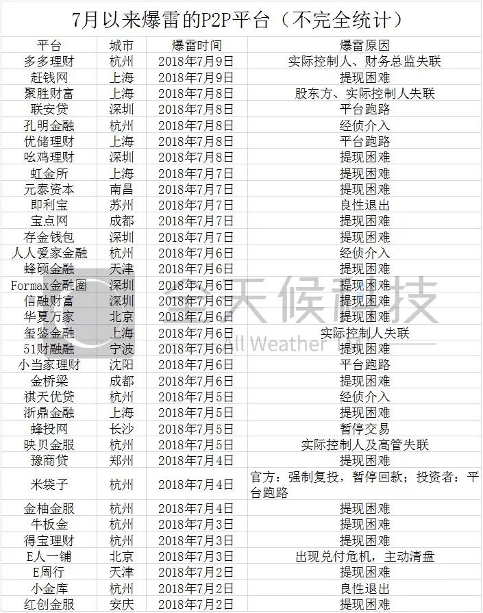 到了7月,P2P平台“爆雷潮”延续,相继有四家交易规模“百亿级”的P2P平台停业,包括钱爸爸(累计交易金额300亿元)、牛板金(累计交易金额390亿)、银票网(累计交易金额140亿元)、投融家(累计交易金额103亿元)。另外,多家规模较小的P2P平台也卷入“爆雷潮”。统计显示,7月初至今,出事的P2P平台总数已超过30家。