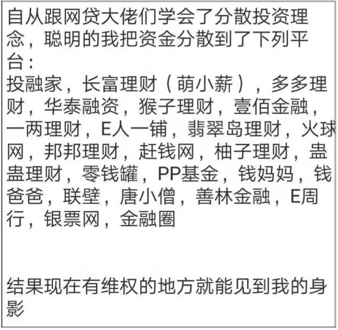 “你看重平台给的利息,平台看重你的本金…我两天吃睡都不好,亏了钱不敢跟家里人说…xx狗赔我血汗钱……”临近午夜,一家爆雷P2P平台的“受害者抱团维权群”里,发言依然十分活跃,大家要么叹息自己亏损巨大、悔不当初,要么讨论报警立案的最新进展,还有人张罗集体去P2P平台总部上门维权。