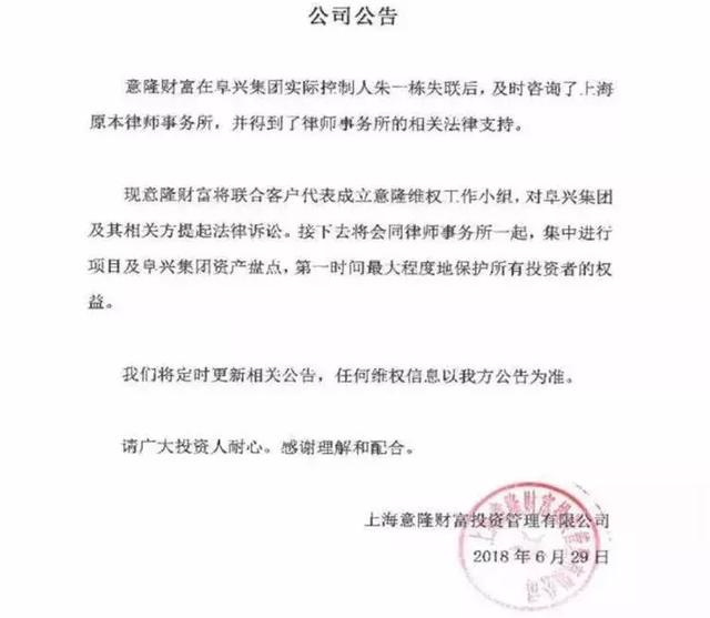 6月26日,意隆财富被公关机关查封,人去楼空。公司申明则称,其多个私募基金产品的相对方阜兴集团实控人朱一栋已经失联。