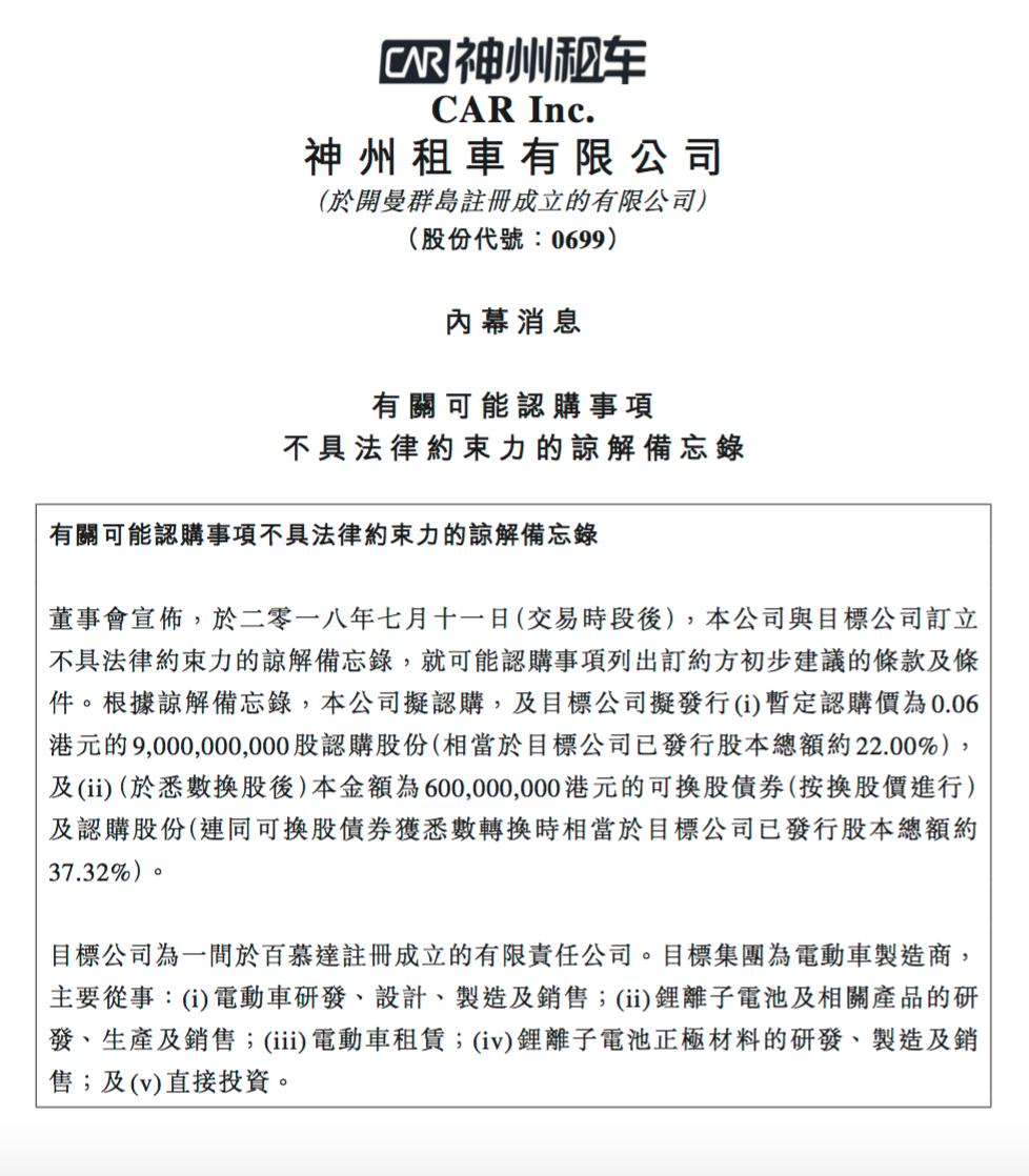 昨日晚间,神州租车在港交所发布公告称,拟以每股0.06港元的价格认购90亿股五龙电动车,合计港币5.4亿元。神州租车还将认购目标公司发行的本金为6亿港元可换股债券。按五龙电动车现有股本计算,完成认股和债转股后,神州租车股份比例将从22%扩大至37%,成为其最大股东。