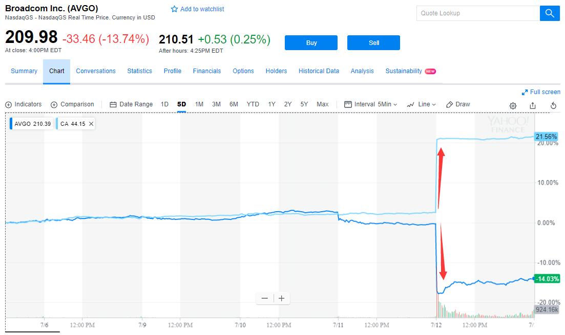 周四美股开盘后,博通一度跌至197.46美元,跌近19%,触及逾一年半新低,最终收跌逾13.7%,收报209.98美元。CA跳空高开,盘中刷新逾18年盘中高位,一度升破44美元,最终收涨18.65%,报44.15美元。
