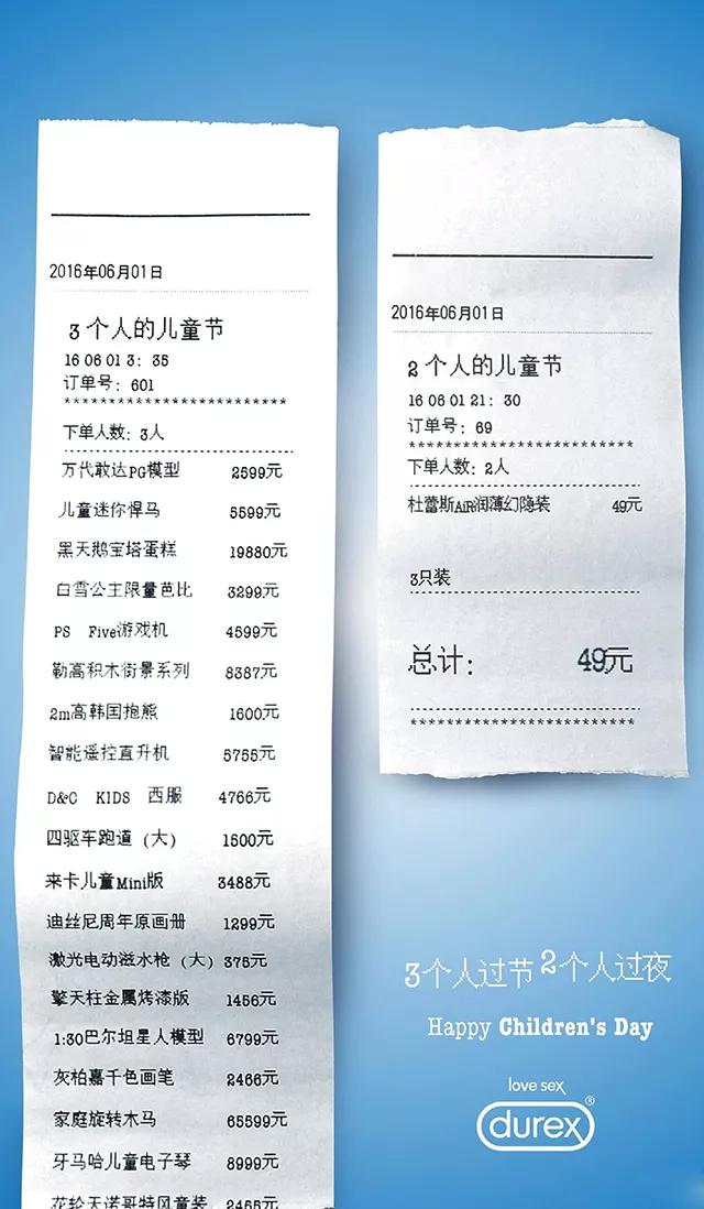 之前六一儿童节的时候,老司机杜蕾斯发了一个“3个人的儿童节”和“2个人的儿童节”海报。意思就是:
