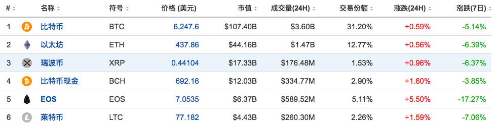 比特币 BTC 报 6247.6 美元,7 日内涨跌幅 -5.14%;