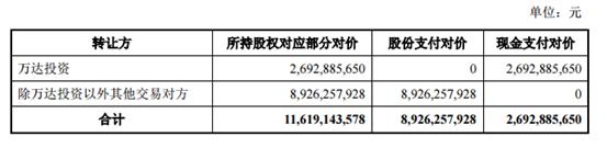 大股东万达投资所持万达影视股权的对价为26.93亿元,将由万达电影分三期以现金支付;另外一部分万达影视股权的对价为89.26亿元,是由除万达投资以外的其它交易对方所持有。万达电影将以50.00元/股的价格非公开发行1.79亿股进行支付。