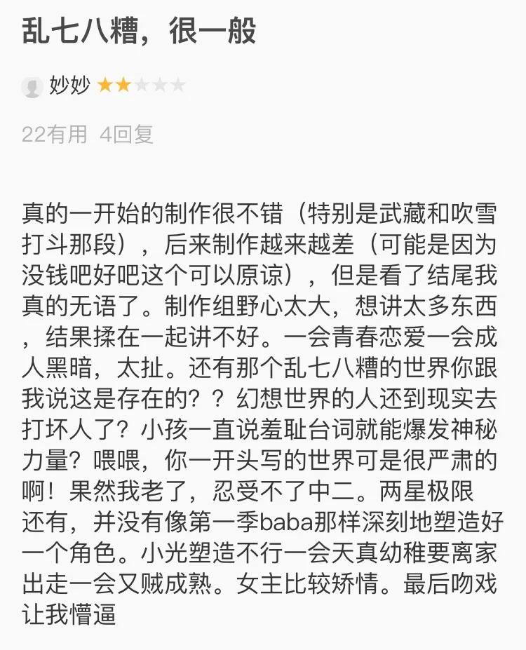 知乎用户“龙堆”表示:“前期吹爆,后期直线崩,最后一集一言难尽,大概是期望越高失望越大,这是最最失望的最后一集了。”知乎用户“Coldrain”指出:“虎头蛇尾的一部作品。结尾真是崩的一塌糊涂,真的感觉像是半路被腰斩的作品。”