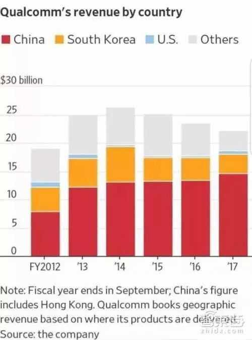 根据高通财报数据,2017财年高通的全球总营收为223亿美元,其中的150亿美元都来自于中国市场,占比已经超过了60%。