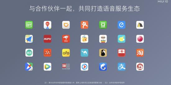 在小米8发布会上,展示出小爱同学于30余款APP合作,共同打造语音服务生态,包括常用的视频、导航、音乐、出行、购物等APP。