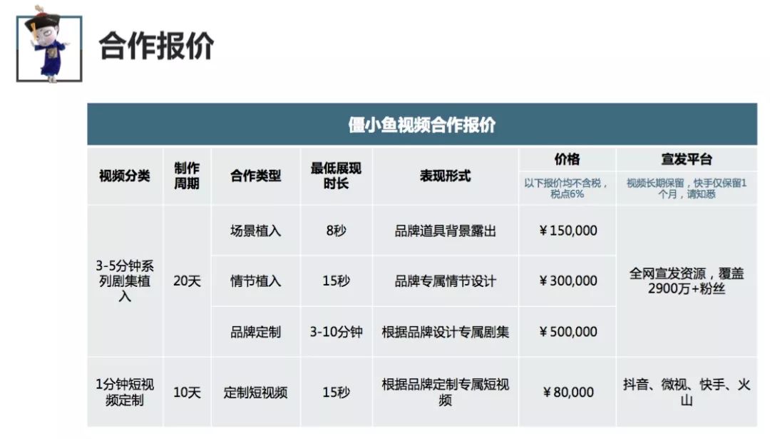 据爱范儿拿到的一份“僵小鱼合作刊例价资料”显示,目前“僵小鱼”抖音账号可以根据品牌需求定制 1 分钟短视,制作周期为 10 天,收费为 8 万。