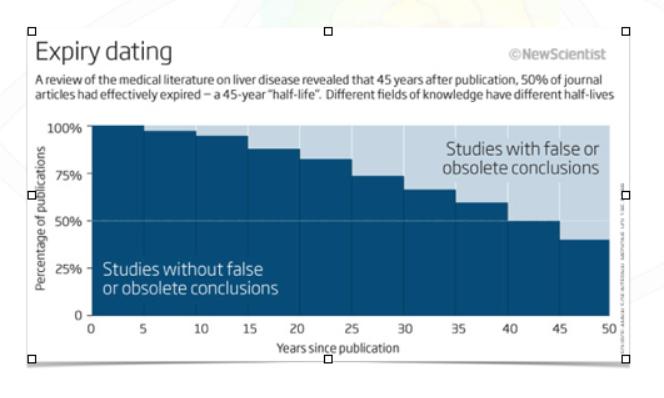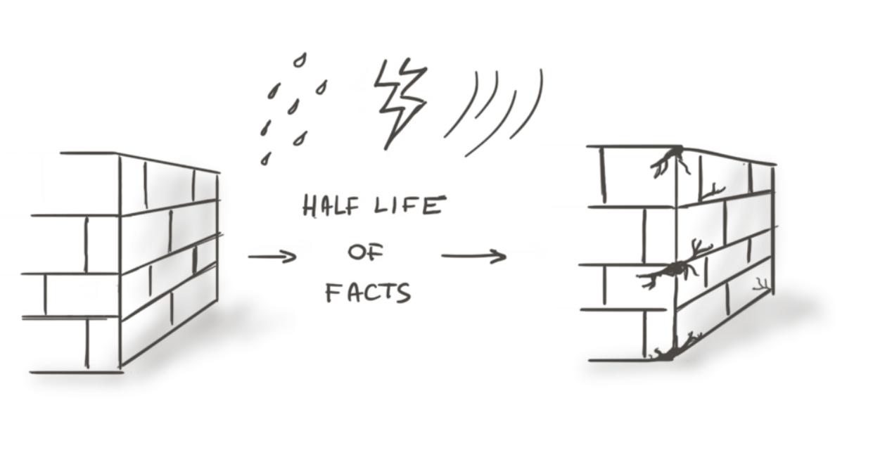在我们建立知识基础的同时,知识的也即将“过期”。让我意识到这一现实的书是《 The Half Life of Facts: Why Everything We Know Has An Expiration Date》,这让我很害怕,因为它指出了,如果你得了肝病,去找一个45年前从医学院毕业的医生,医生给出的信息可能有一半都是错误的: