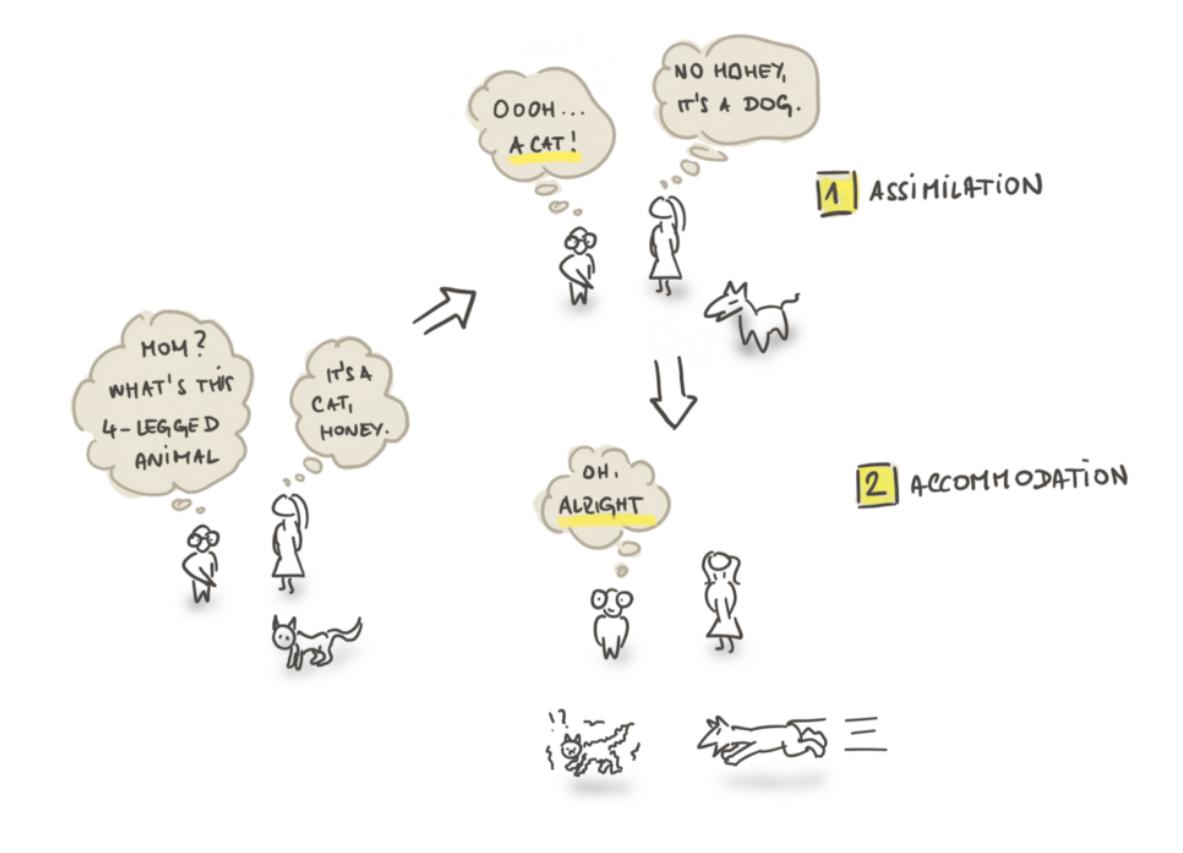 男孩首先试图通过将新知识融入他现有的模式来吸收新知识。猫有四条腿。狗也是。所以它们是一样的。