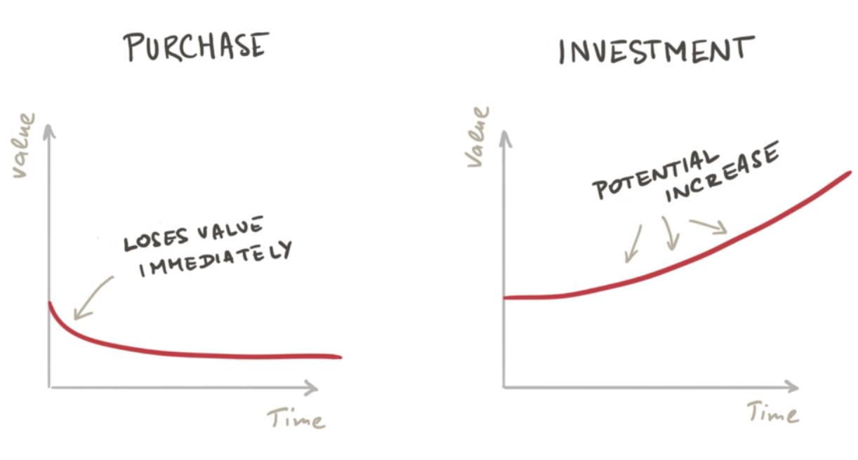 个人理财领域最大的区别之一就是消费和投资。消费会立即失去价值,而投资有可能增加价值。例如,买一辆车是一种消费行为——一旦你把一辆新车开出了4S店,它就失去了大部分价值。另一方面,房子是一种投资:它有增值的潜力。