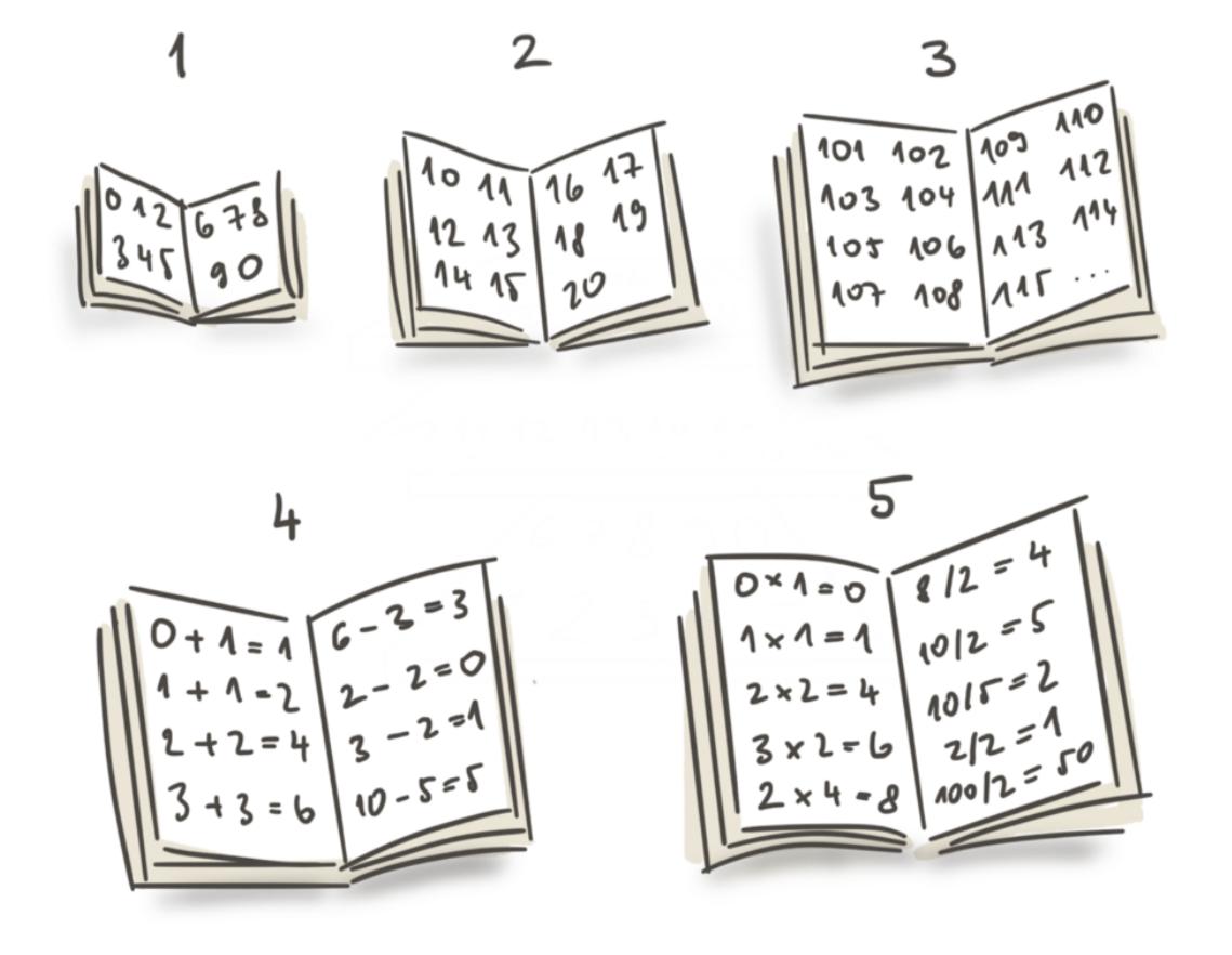 例如,在数学方面,我们都是从认识一位数开始,然后两位数,然后是三位数,然后是加、减、乘、除等等。
