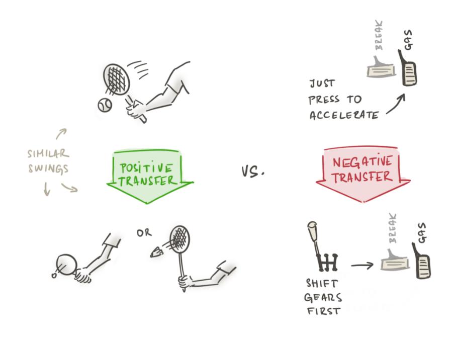 另一方面,负迁移是指,学习某样东西阻碍了学习迁移。如果你曾经从开自动变速器切换到手动变速器,你必须改掉简单地踩油门的习惯,习惯于在加速前接合离合器和换档。如果你的第一语言是像西班牙语、法语或德语这样的欧洲语言,你必须克服英语名词不分性别的事实。或者想象设定密码的场景,当你记住一个密码的时候,你通常被要求创建一个新的。这样做几次,你会很难记住要输入哪一个密码。