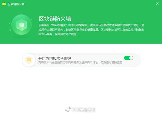 据360安全卫士微博消息,360安全卫士最近发布了区块链防火墙功能,该功能用于解决在用户使用数字货币等区块链相关的产品时,遇到的剪贴板被篡改、数字货币钱包被攻击、账户密码被窃取等安全问题。