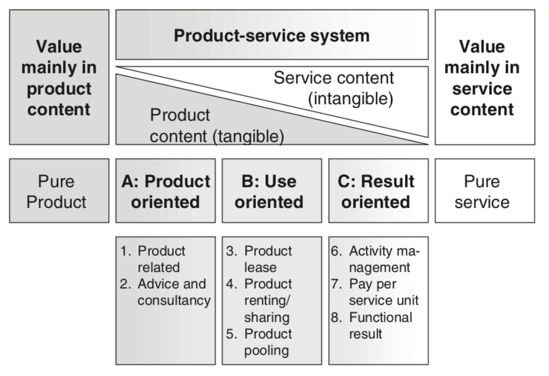 这是学者 Arnold Tukker 在 2004 年的论文中提出的概念。任何企业的产品服务系统都会有实体部分和服务部分,而根据实体部分和服务部分的比例可以分成三大类,第一大类叫做产品导向(Product oriented),第二大类使用导向(Use oriented),第三大类叫做结果导向(Result oriented)。