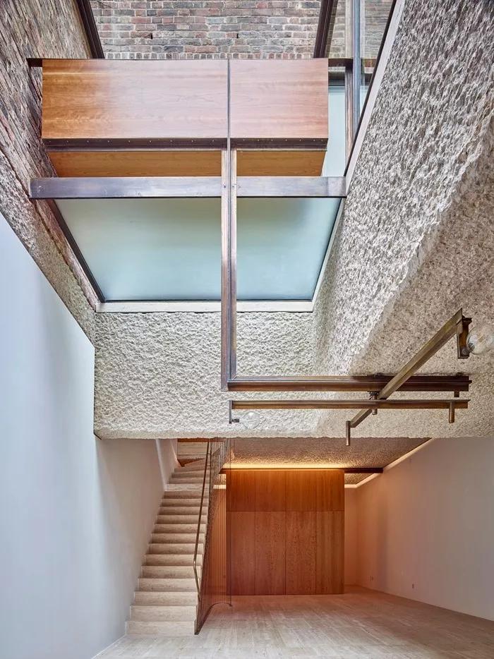 该建筑的设计核心是一个,带有黄铜配件的悬臂式钢制楼梯,楼梯与地板拼接在一起。