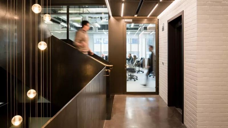 悬挂的楼梯打开了楼层之间的循环路线,让楼层之间的旅程变得轻松有趣,并将光线带入办公楼层。
