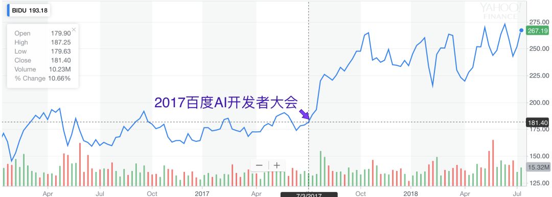 市场反应非常积极,AI开发者大会之后,百度股价终于从两年多的低迷和徘徊中走出,市值从600亿美元蹿升到900亿美元,彻底拉开了和京东的距离。这可能部分归功于投资者对陆奇的信任,以及对百度当时放权的支持,但不能不说在很大程度上也跟百度明确了AI战略有关。