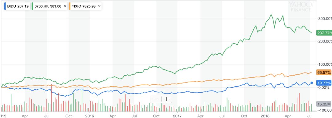 但是,如果看2015年-2018年百度和腾讯的股价对比,就会发现,这3年半百度的股价竟然没有跑赢纳斯达克综合指数。
