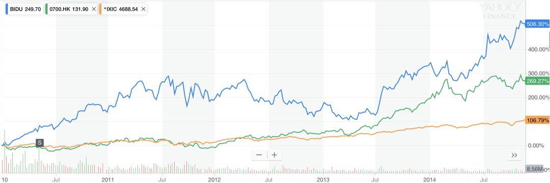 2010年-2015年百度、腾讯和纳斯达克指数的走势
