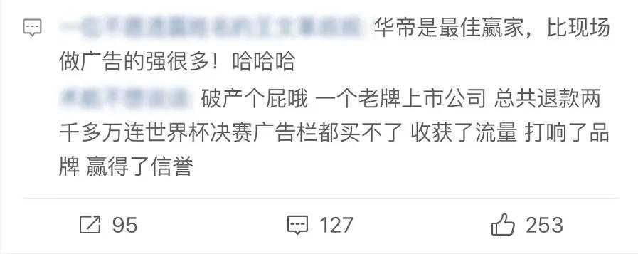 ②从活动的影响范围以及社会各届热议程度看,华帝通过此次“夺冠退全款“活动几乎达到了人尽皆知的品牌知名度提升。不仅是小编,还有很多身边朋友通过这次活动认识和了解了华帝。