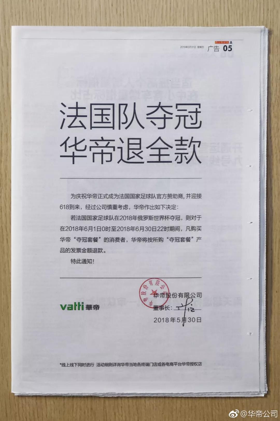 5 月 31 日,华帝在南方都市报发布整版广告,公布了一则由董事长亲笔签名的“法国队夺冠,华帝退全款”声明,并同步在官方微博更新了这份公开、正式的促销承诺。