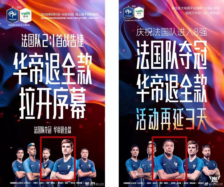 而且在后期的宣传海报上,将当天比赛中大放异彩的天才少年姆巴佩放到了 C 位,不得不说华帝对活动事件的强敏锐度。