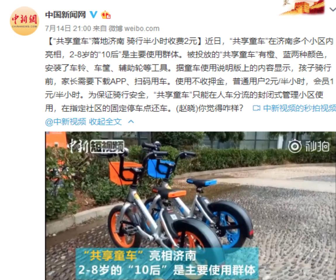 “共享童车”在济南多个小区内亮相,2-8岁的儿童是主要使用群体。“共享童车”有橙、蓝两种颜色,车上安装了车铃、车筐、辅助轮等工具,孩子骑行前,家长需要下载APP、扫码用车,价格方面,其显示使用不收押金,普通用户2元/半小时,会员1元/半小时。