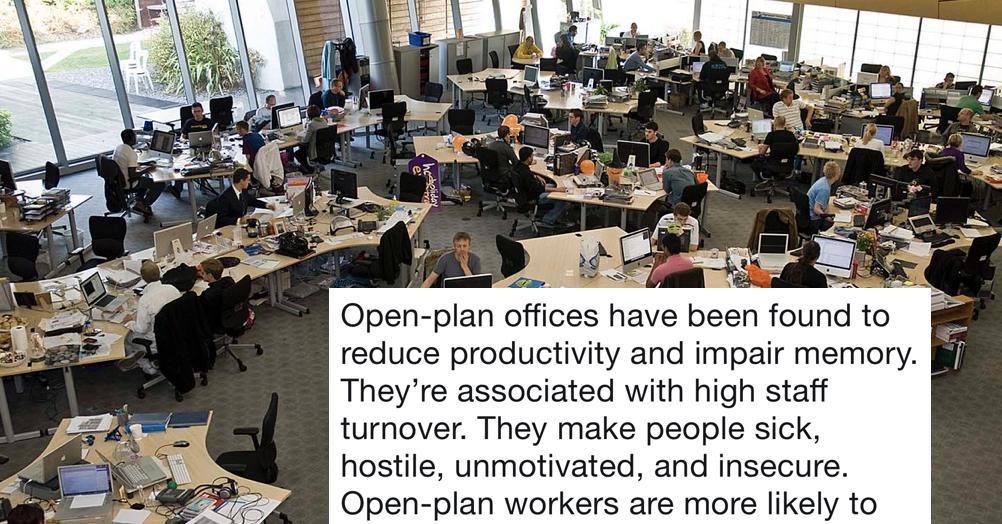 这都不是什么新鲜的讨论了。早就有一系列研究说明,开放型办公室是压力、冲突和员工离职的导火索。但是很多技术企业还是默认用开放型办公室,面对这样安排,大家还都默默忍着、接受。简直是莫大的讽刺。