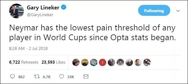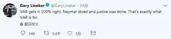 除了吐槽内马尔是不能忍痛的“小公举”,莱因克尔也撑过本届世界杯的 VAR 技术,认为内马尔假摔。