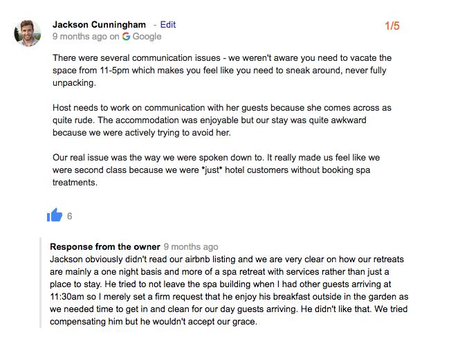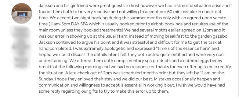 几周后,我看到房东给我写了一个批评我的评论,评论中所述完全扭曲了事实,与实际情节严重不符。