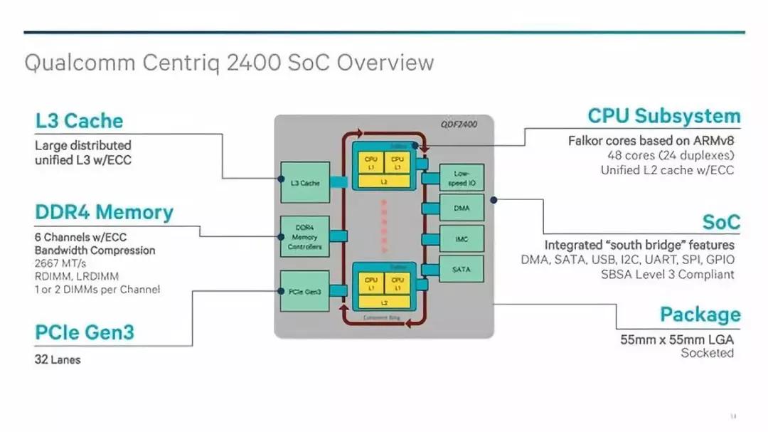 两年后,高通的第一款定制级(ASIC)服务器芯片 Centric 2400 上世,采用三星 10nm 工艺,基于 ARM v8 架构的自研 Falkor CPU 核心。至今为止,Centric 2400 系列相继推出三款。据官方数据显示,高通 Centriq 2460 性能比优于同代的英特尔 Xeon8180 处理器,并且价格仅为后者的 1/5。
